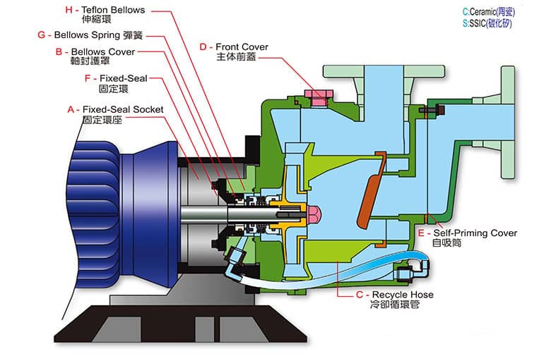 .適用溫度:FRPP/CFRPP-85℃以下,PVDF-90℃以下,CPVC-70℃以下,視各種化學性質不同而定。 .機械軸封設計:采用Teflon Bellows Seal自冷式設計,并有冷卻循環回路,在空轉時會利用泵內部的液體循環冷卻機械軸封,軸封材質:Sic,Carbon,Ceramic。 .自吸式設計:自吸力特強,自吸力可達20ft,3″機種使用有舌單向閥規格,才有自吸能力。 .抗腐蝕性:采用FRPP塑鋼材料射出成型,有FRPP,CFRPP,CPVC,PVDF可抵抗大部份的酸堿液。 .軸封護罩設計:采用可分解設計易拆卸更換,以耐高溫塑鋼制成,耐高溫120℃,不易因空轉損壞。
