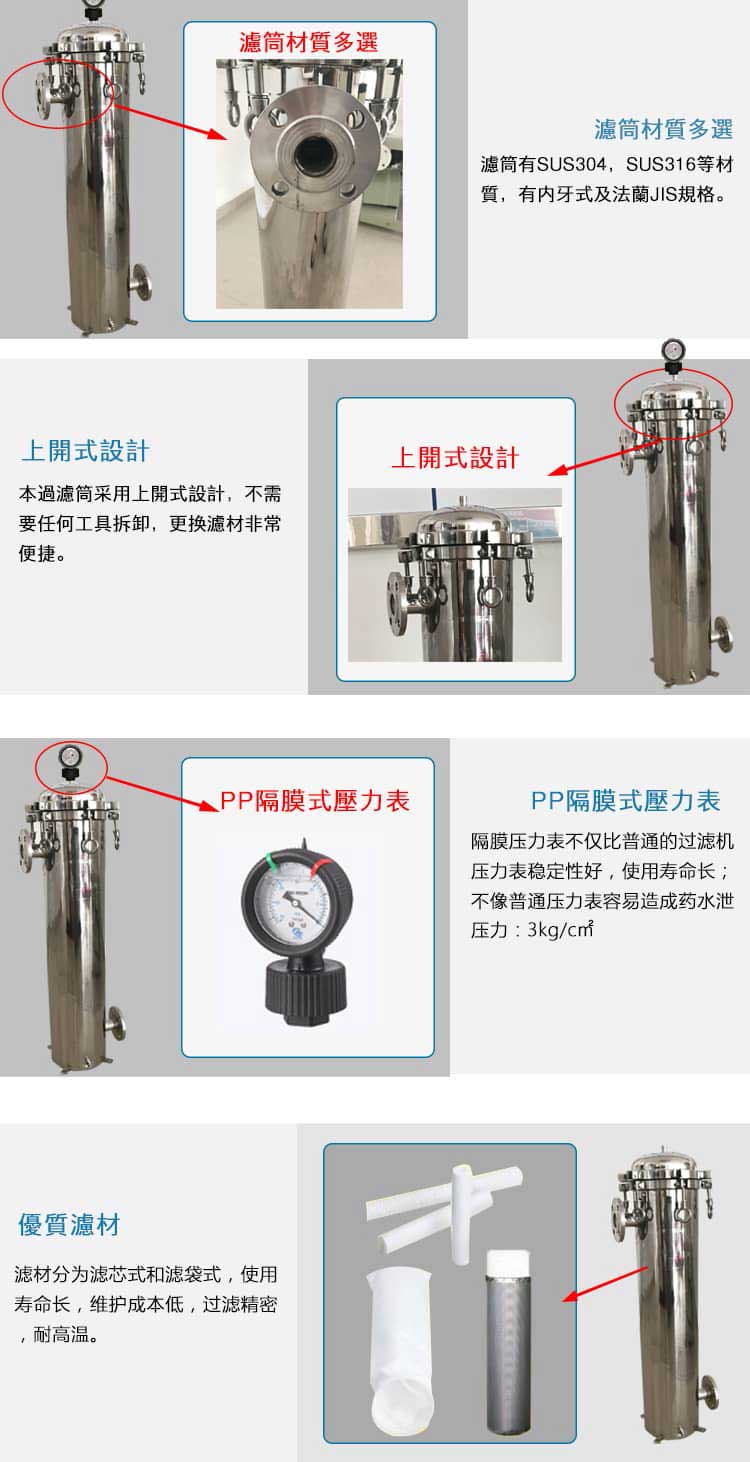 2.外殼進出口與過濾系統管路相連,連接時注意方向,確保濾芯為外側進水、內側出水狀態.